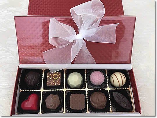 下段:テイーハート(赤いチョコの中は、ミルクチョコレートにアールグレイ)、キャラメルブールサレ、シャンパン、グランマニエ、アールグレイ - トリュフチョコレートシリーズは550円~2500円です。