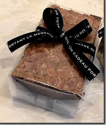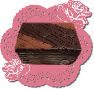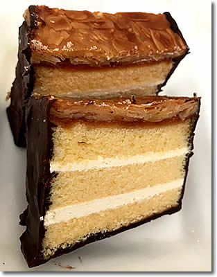 スポンジケーキにバタークリームがサンドされ、上はアーモンドがいっぱい、周りはチョコレートでコーティングしています。